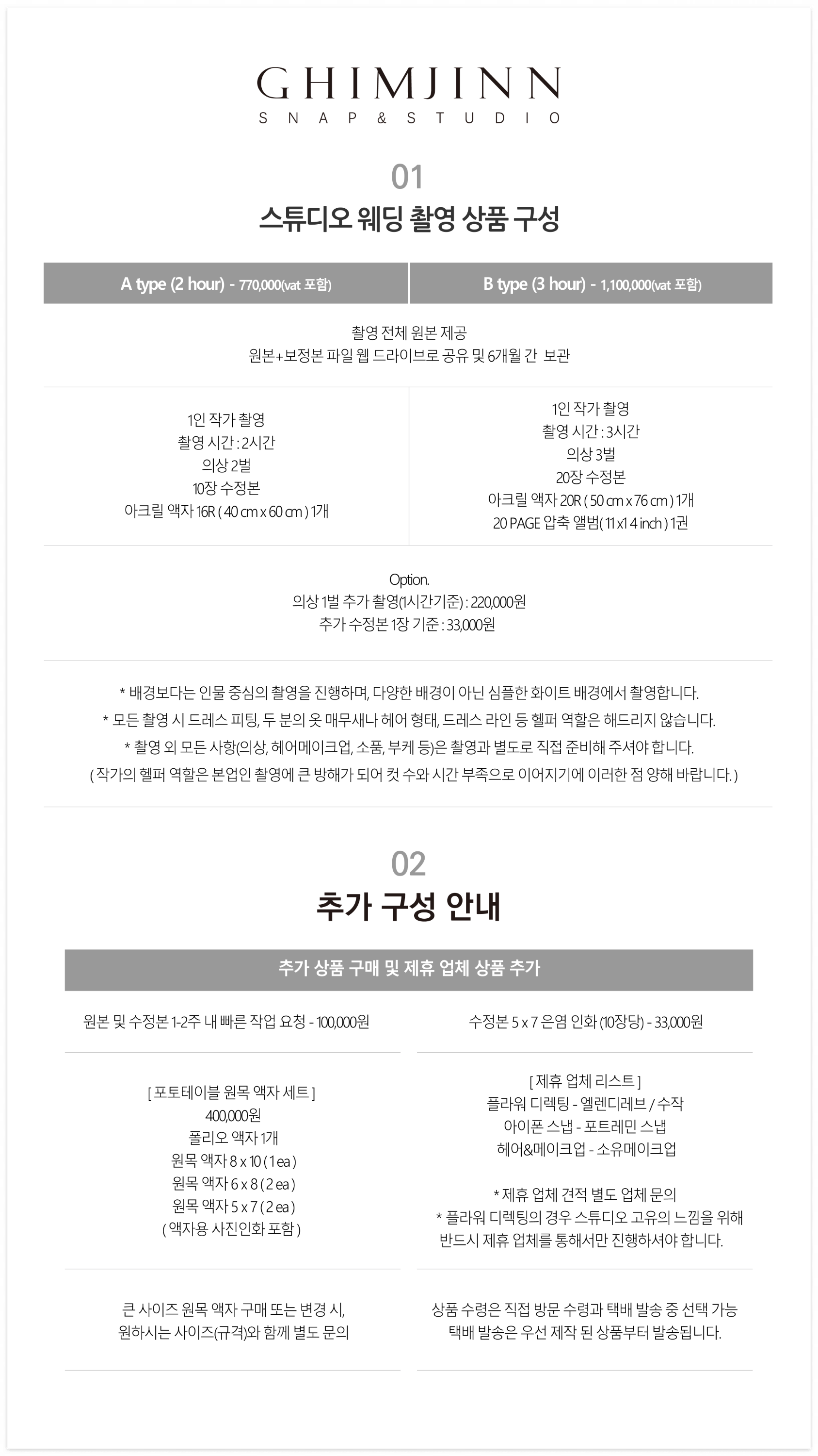 고화질 원본과 수정본을 기본적으로 제공해 드리기 때문에 필수 추가금이 없으며, 상품 추가를 강요하지 않습니다.