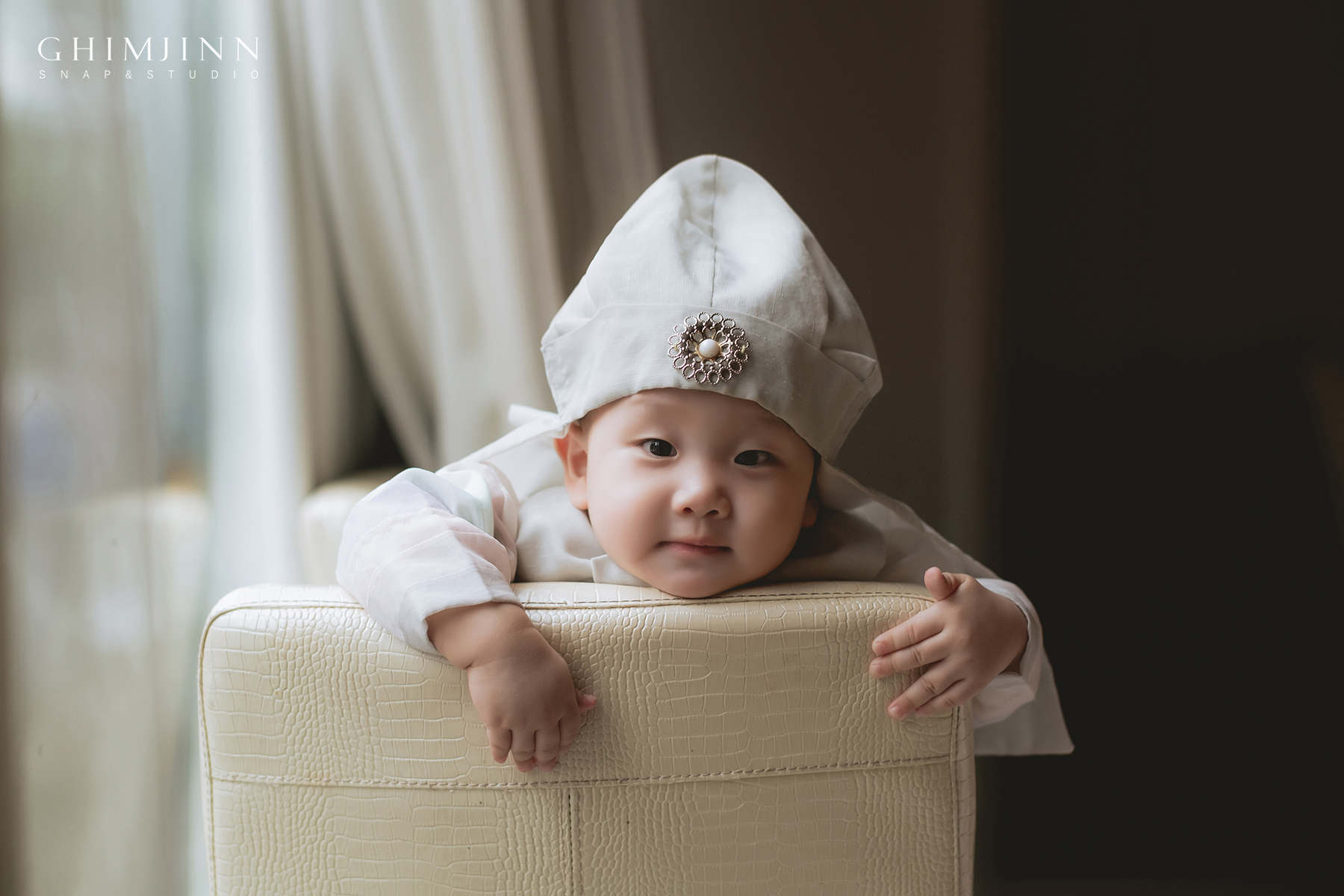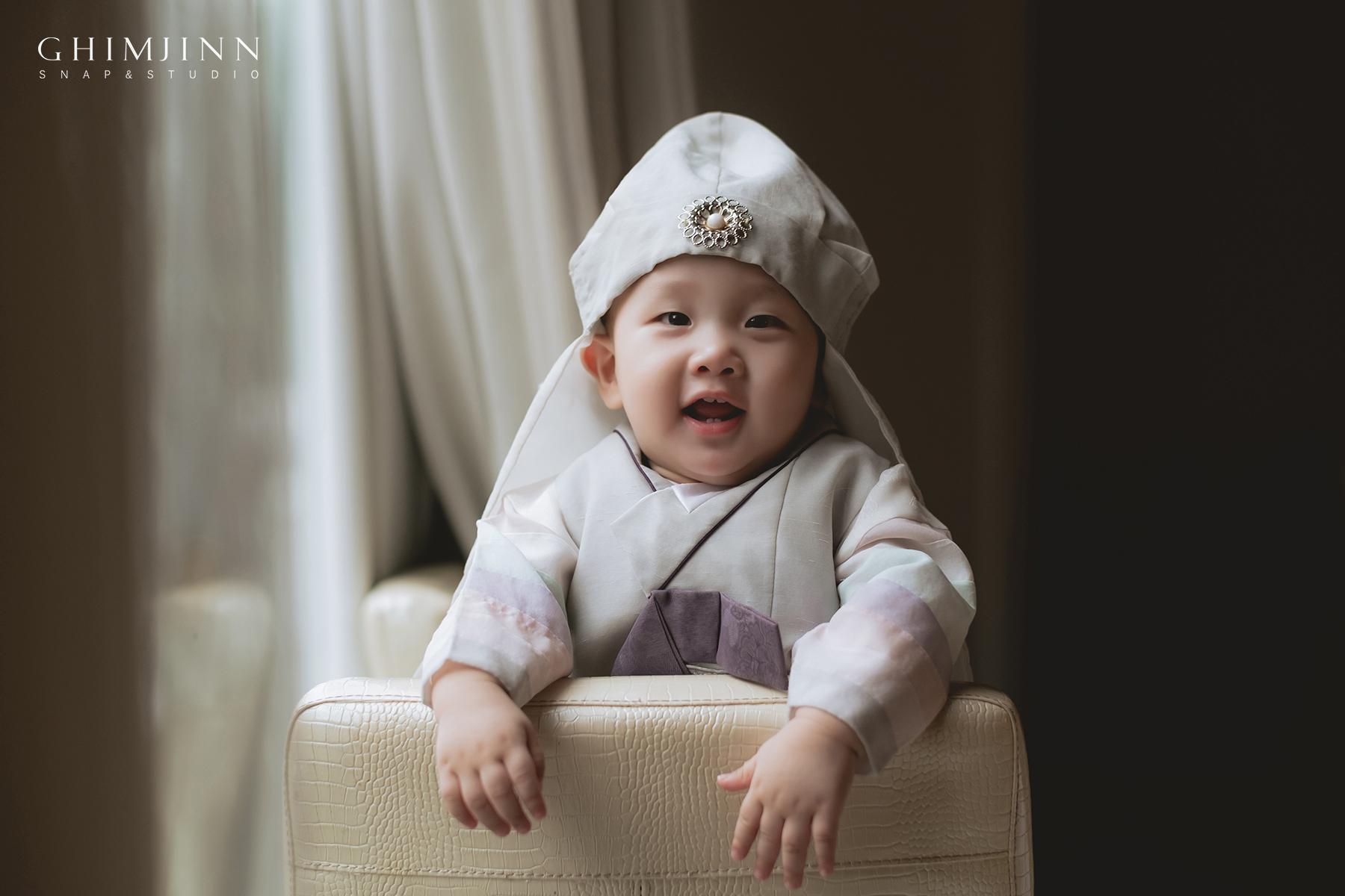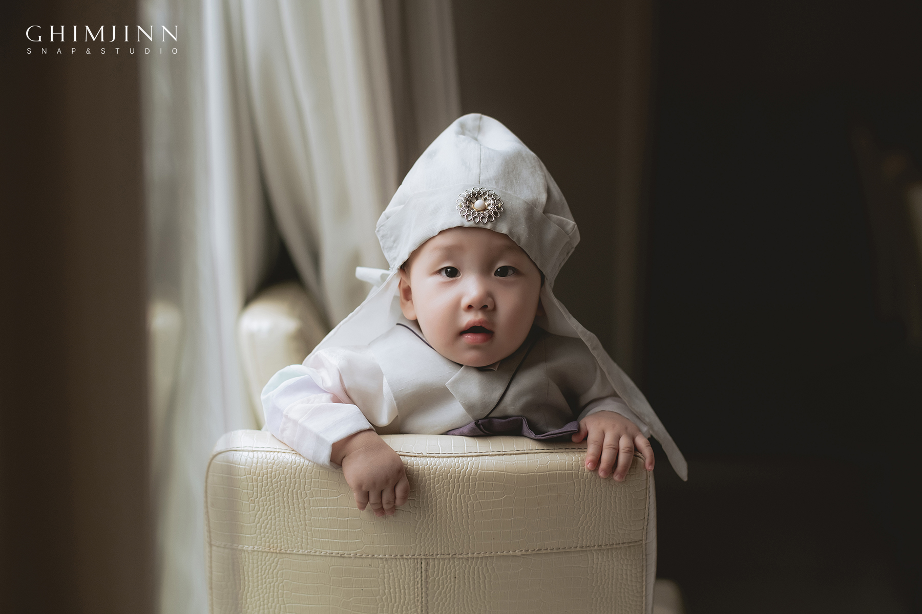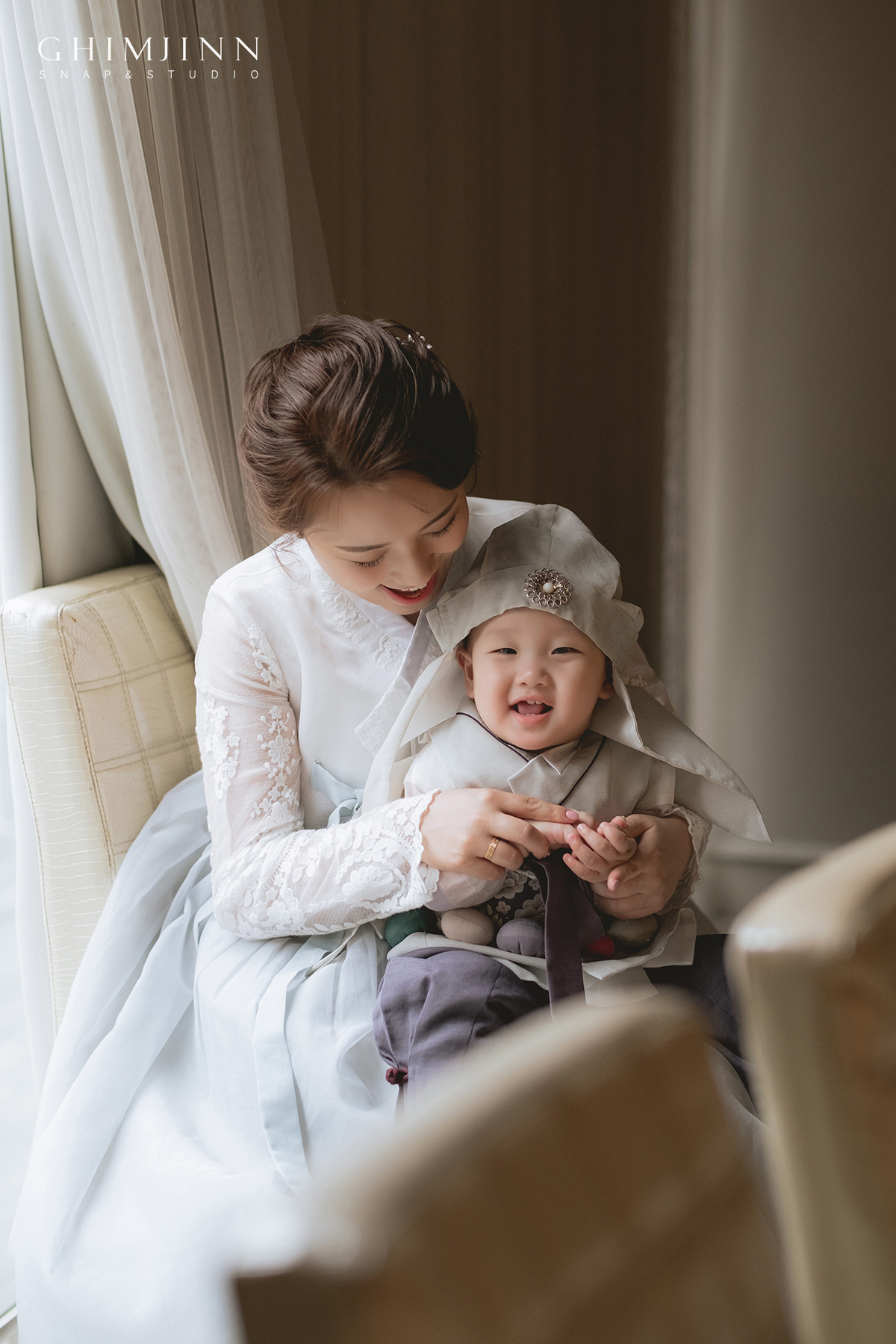 야외 촬영을 하고 돌아와 우리 주인공의 컨디션이 괜찮았기에 창가가 있는 빈 홀에서도 촬영을 진행했어요. 자연광이 비치는 큰 창가가 있는 홀은 실내 촬영 시에 정말 좋아요. 야외 촬영이 힘든 추운 겨울이나 한 여름에 돌잔치를 하시는 가족분들에게 추천드려요. :)